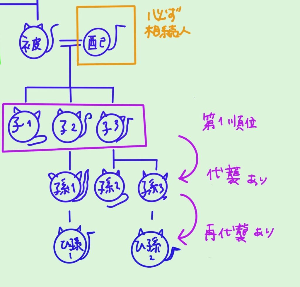 子→孫→ひ孫→玄孫・・・すでに主たる相続人が亡くなっていた場合の話なので、ここまで先にはいくことはあまりないですが・・・知識として覚えておいてもいいかもしれません。