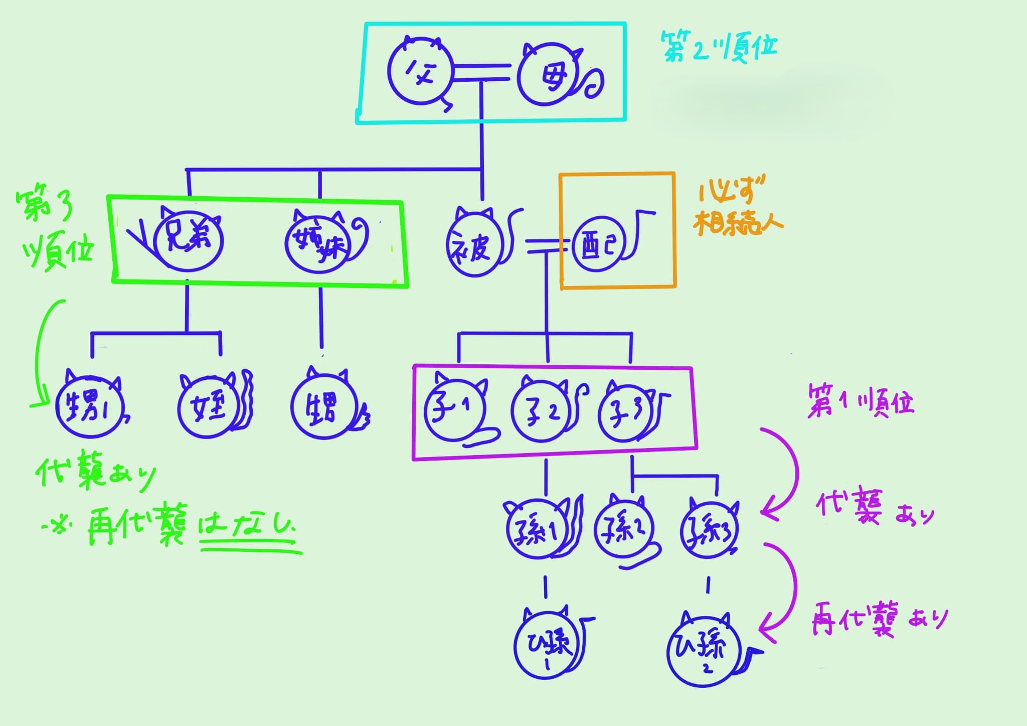 子→孫→ひ孫→玄孫・・・すでに主たる相続人が亡くなっていた場合の話なので、ここまで先にはいくことはあまりないですが・・・知識として覚えておいてもいいかもしれません。